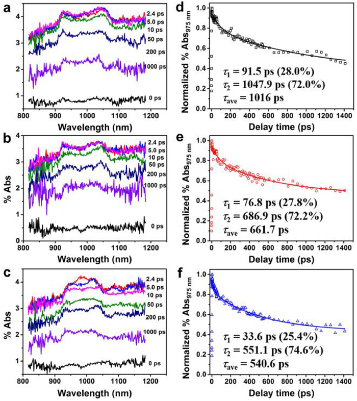 Fig. 4. Transient absorption spectra of pristine g-C3N4 (a), CC-120 (b), and CCN-25 (c) at different time delays following the excitation at 400 nm. The normalized time profiles of transient absorption at 975 nm for g-C3N4 (d), CC-120 (e), and CCN-25 (f). The time profiles were fitted according to the equation: ΔA = ![]() ![]() |