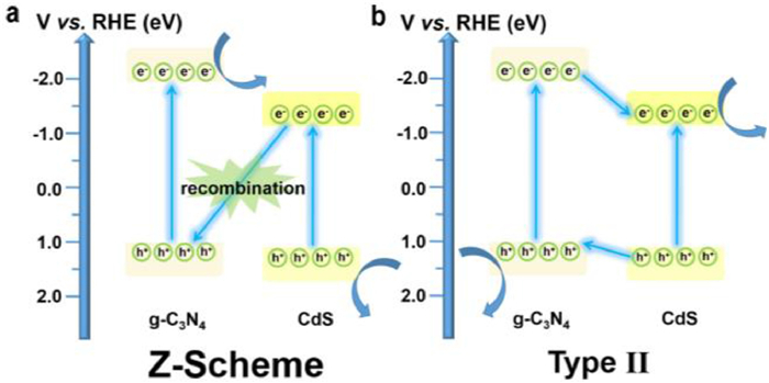 Photochemical, a facile and rapid process for depositing noble metal nanoparticles on light-response substances, is commonly harnessed to fabricate catalysts in photocatalysis [15-17]. It has been proved that the photo-excited electrons (holes) generated in semiconductors could migrate to certain places to reduce some metal precursors, leading to the selectivity attachment of metal particles on substrate surface [18]. The resulted composite exhibits advantages in charge separation due to the regulation of excited electron flow direction compared with that prepared by traditional methods [19]. Inspired by this, photochemical process has also been extended from metals to semiconductors, and a series of CdS-based photocatalysts have been developed [20-22]. Among them, CdS/g-C3N4 catalyst is widely synthesized by many researchers [19, 23]. While the fundamental photophysical processes have been poorly understood between the host and guest semiconductors, leading to the insufficient evidences to prove the type of CdS/g-C3N4 heterostructure (Z-S or type Ⅱ) [19, 24]. More importantly, previous photoinduction obtained CdS-based catalysts usually contain high weight percent of CdS, and it is well known that CdS is an effective photocatalyst for HER [19, 25]. Therefore, whether the enhanced catalytic activity of heterostructures comes from the incorporated CdS or the facilitated charge separation also requires a deep discussion.