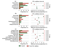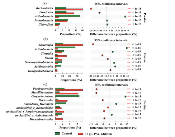 | Fig. 2. Comparison of microbial community between control and 15 g/L PAC reactor based on Fisher exact test at 95% confidence intervals: (a) phylum level, (b) class level, and (c) genus level. | |