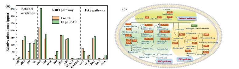 | Fig. 3. Comparison of the relative abundance on caproate-producing associated functional genes at control and 15 g/L PAC reactor microbiome (a), and functions enhanced by PAC addition (b). In (b), the increased genes were added with red character underline and the decreased genes were added with green character underline. | |