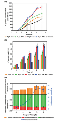 | Fig. 1. Comparison of caproate production performance at different PAC dosages: variations of caproate concentration (a) and yield (b) during 7 days reaction, and the substrate consumption and caproate production (left Y-axis), and caproate selectivity (right Y-axis) (c). | |