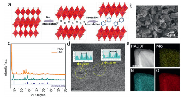As shown in Fig. 1a, the PANI intercalated MoO3 was synthesized via a two-step method. MoO3 layer was firstly swelled by chemical reduction and formed hydrated sodium molybdenum bronze as a result [36]. The interlayer alkali metal cations are important in promoting the dispersion of the oxide layers during the intercalation process, since the extent of the layer exfoliation depends on the alkali-metal cations originally present in the bronze [37]. Then the PMO was prepared via an ion-change process by reacting NMO with aniline in the present of oxidizing agent. The morphology of as-prepared NMO and PMO was characterized by scanning electron microscope (SEM), as presented in Fig. S1 (Supporting information) and Fig. 1b. The NMO shows a stacked morphology that comprises aggregates of nanosheets. The PMO shows similar morphology with its precursor, indicating the incorporation of PMO does not destroy the nanosheet structure and there is no large bulk of PANI deposit on the MoO3. The X-ray diffraction (XRD) and transmission electron microscope (TEM) were further operated to explore the crystal structure of PANI-intercalated MoO3. As shown in Fig. 1c, the XRD pattern of NMO sample can be well assigned to [Na(H2O)0.25]MoO3 (JCPDS No. 39–0634) with a interlayer spacing of 0.98 nm. After PANI intercalation, the interlayer spacing of MoO3 was remarkably enlarged to 1.36 nm which may due to the intercalated PANI into MoO3 interlayer in helical chain configuration or with the benzene rings lying roughly perpendicular to the layers, similar to the case of the poly(pphenylenevinylene) MoO3 composite. The interlayer spacing (1.35 nm) of PMO was further confirmed by HRTEM (Fig. 1d), which was in great agreement with XRD results. The element mapping images of as-prepared PMO were shown in Fig. 1e, which demonstrated the even distribution of C, N, O, Mo elements and the completely substitution of PANI to Na+ as the intercalation.