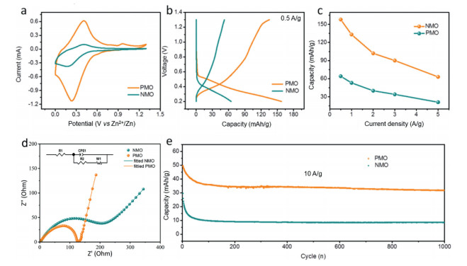 | Fig. 3. (a) CV curves at a scan rate of 0.2 mV/s. (b) GCD profiles at a current density of 0.5 A/g. (c) Rate performance range from 0.5 A/g to 5 A/g. (d) ESI analysis and (e) long-term cycling performance at 10 A/g of PMO and NMO. | |