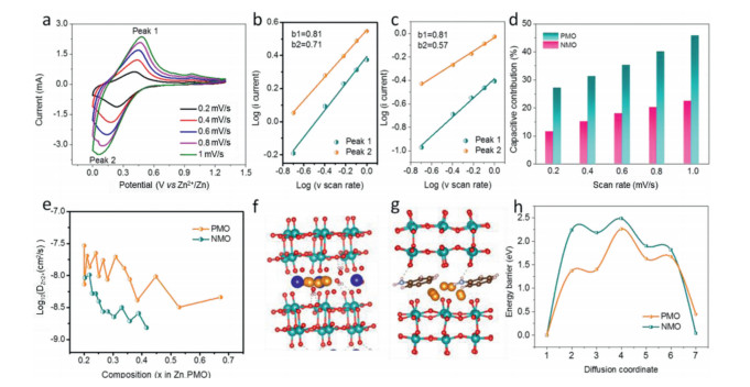 | Fig. 5. (a) CV curves at different scan rates of PMO. log(i) versus log(v) plots of redox peaks of (b) PMO and (c) NMO. (d) Normalized contribution ratios of capacitive storage to total capacity at different scan rates and (e) Zn2+ diffusion coefficients at various states of discharge during GITT measurements of PMO and NMO. Zn2+ diffusion pathways of (f) NMO and (g) PMO. (h) Diffusion barrier profiles of Zn2+ transport in NMO and PMO. | |