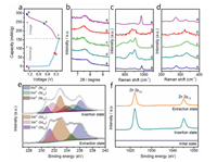 | Fig. 4. (a) The second cycle of GCD profiles of PMO. (b) Ex-situ XRD patterns, (c, d) ex-situ Raman spectras at the discharge and charge states of PMO. (e) Mo 3d and (f) Zn 2p XPS spectras at the discharge and charge states of PMO. | |