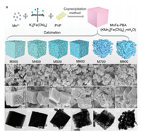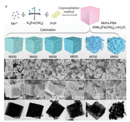 | Fig. 1. (a) Schematic illustration of the formation of MnFe–PBA precursor and the structural evolution of the M300–M800 samples at different temperatures. (b1−b6, c1−c6) SEM images, and (d1−d6) TEM images of M300–M800. | |