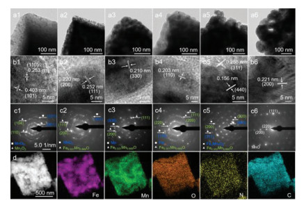 | Fig. 2. (a1−a6) TEM images, (b1−b6) HRTEM images, (c1−c6) SAED patterns of M300–M800. (d) EDS elemental mapping images of M600 sample. | |