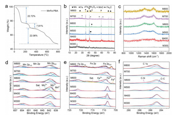| Fig. 3. (a) TG curve of MnFe–PBA tested in N2. (b) XRD patterns and (c) Raman spectra of M300–M800. XPS patterns of M300–M800: (d) Mn 2p spectrum; (e) Fe 2p spectrum; (f) C 1s spectrum. | |