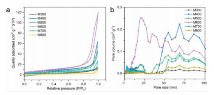 | Fig. 4. (a) Nitrogen adsorption-desorption isotherms and (b) pore size distributions of the M300−M800 samples. | |