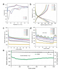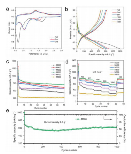 | Fig. 5. Electrochemical performance. (a) Cyclic voltammetry and (b) discharge-charge curves of the M600 at the current density of 100 mA/g. Comparative (c) cycle performance and (d) rate capabilities of the M300–M800 samples. (e) Long cycle performance of M600 at the current density of 1 A/g. | |
