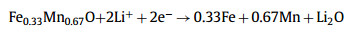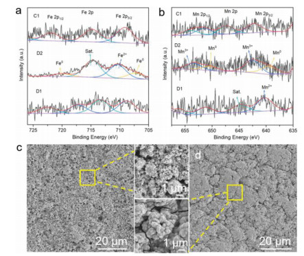 | Fig. 6. XPS patterns of M600 sample in charge and discharge process: (a) Fe 2p spectrum, (b) Mn 2p spectrum. Electrode-surface SEM images of M600: (c) Before cycling and (d) after 50 cycles at 100 mA/g. | |