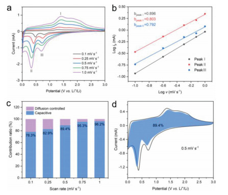| Fig. 7. (a) CV curves at different scan rates. (b) Relationship between logi and logv plots of the anodic and cathodic peaks. (c) Histogram of the capacitive contribution at different scan rates and (d) capacitive contribution at the scan rate of 0.5 mV/s of M600 sample. | |