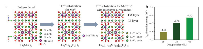 | Fig. 1. Design of unequal-valent Ti4+-substitution Li1-x[Li1/3Mn2/3]1-xTixO2 with interlayer Li vacancies. (a) The atomic structure evolution from fully ordered Li2MnO3 (left) to equal-valent Ti4+ substituted Li2Mn1-xTixO3 (middle), and then to unequal-valent Ti4+ substituted Li1-x[Li1/3Mn2/3]1-xTixO2 with interlayer vacancies (right). (b) The theoretical calculation results of vacancy (Li) formation energy in Li2MnO3. | |