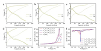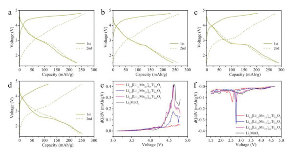 | Fig. 4. First-two cycles charge/discharge curves of (a) Li2MnO3, (b) Li0.9[Li1/3Mn2/3]0.9Ti0.1O2, (c) Li0.7[Li1/3Mn2/3]0.7Ti0.3O2, and (d) Li0.5[Li1/3Mn2/3]0.5Ti0.5O2 at 10 mA/g. The corresponding dQ/dV plots of (e) charging process and (f) discharging process related to the first cycle. | |