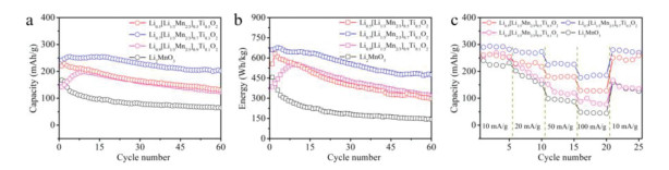 | Fig. 5. (a) Capacity, (b) energy density, and (c) rate performance of the Li1-x[Li1/3Mn2/3]1-xTixO2 (x = 0, 0.1, 0.3 and 0.5) at a current density of 50 mA/g. | |