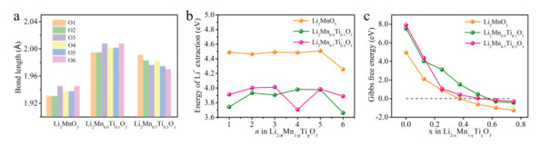 | Fig. 6. (a) Calculated bond length of TM-O between oxygen and transition metals in Li2MnO3, Li2Mn0.9Ti0.1O3 and Li2Mn0.7Ti0.3O3, respectively. (b) Calculated formation energies of Li vacancies in Li2MnO3, Li2Mn0.9Ti0.1O3 and Li2Mn0.7Ti0.3O3. (c) Calculated reaction Gibbs free energy of O2 release from the lattice of Li2-xMn1-yTiyO3, with x = 0, 0.125, 0.25, 0.375, 0.5, 0.625, 0.75, and y = 0, 0.1, 0.3. | |