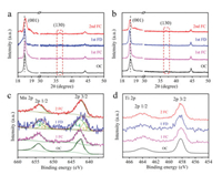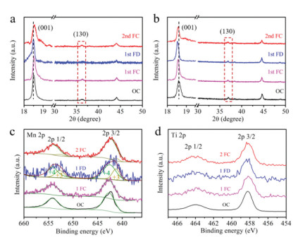 | Fig. 7. Ex-situ XRD patterns of (a) Li0.7[Li1/3Mn2/3]0.7Ti0.3O2 and (b) Li2MnO3 cathodes. And ex-situ XPS spectra of the Li0.7[Li1/3Mn2/3]0.7Ti0.3O2 electrode for (c) Mn and (d) Ti elements. | |