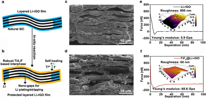 | Fig. 1. Schematic illustration of the in-situ process and physical characterization of the TiF4@Li-rGO electrode. Schematic illustration of the (a) Li-rGO and (b) TiF4@Li-rGO. Cross-sectional view of the (c) Li-rGO and (d) TiF4@Li-rGO electrode. The contrast stress force-distance curves of (e) Li-rGO and (f) TiF4@Li-rGO electrodes. The corresponding three-dimensional AFM scanning images of the surface for the different electrodes are shown as insets. | |