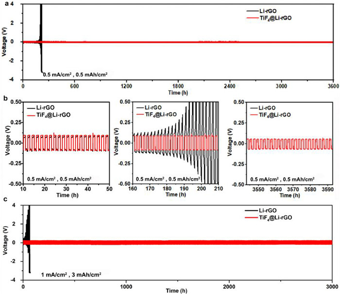 | Fig. 2. Electrochemical characterizations of the symmetric cells for Li stripping/plating. Galvanostatic cycling of symmetric Li-rGO anode (black) and TiF4@Li-rGO anode (red) with current density fixed at (a) 0.5 mA/cm2 and stripping/plating capacity of 0.5 mAh/cm2, and (b) corresponding enlarged view of voltage profiles at different cycles. (c) Cycling stability test with current density fixed at 1 mA/cm2 and stripping/plating capacity of 3 mAh/cm2. | |