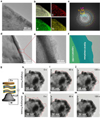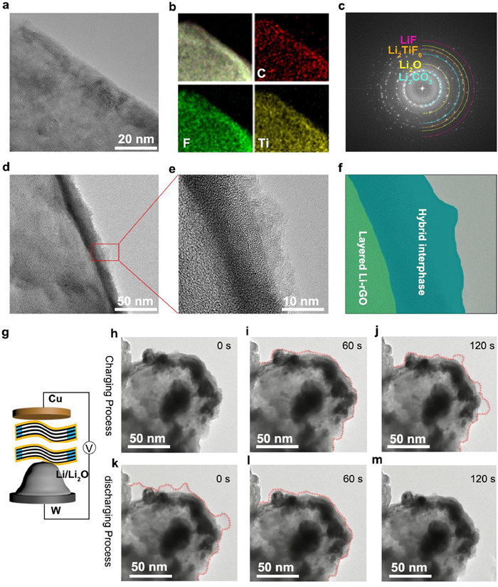 | Fig. 3. Ex-situ and in-situ TEM characterization of the hybrid interphase for 3D layered TiF4@Li-rGO electrode. (a) HRTEM image of the hybrid interphase for TiF4@Li-rGO electrode before activation. (b) Composition analysis of the hybrid interphase for TiF4@Li-rGO by energy-dispersive X-ray spectroscopy mapping. (c) SAED (selected area electron diffraction) of the hybrid interphase for TiF4@Li-rGO. (d) TEM image of the hybrid interphase for TiF4@Li-rGO electrode after activation at low magnifications. (e) HRTEM image of the hybrid interphase for TiF4@Li-rGO electrode after activation. (f) Schematics of the observed hybrid interphase structure on TiF4@Li-rGO. (g) Scheme of in-situ TEM cell configuration. in-situ TEM images of the Li (h-j) charging and (k-m) discharging process on Cu grid decorated with nano-level TiF4@Li-rGO taken at different times. | |