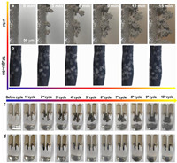 The liquid cell has been established for visualizing the evolution of lithium metal anodes during the charging and discharging process using operando optical microscopy. The proof-of-principle of the method directly characterizes electrochemical process under realistic conditions. Figs. 4a and b were taken at discrete time points separated by a fixed 3-min interval. It is observed that the Li foil electrode is prone to forming a moss-like dendritic structure. In comparison, the TiF4@Li-rGO electrode did not form the dendritic structure. Furthermore, it is seen that the overall volume maintained the same level. Optical observation of each electrode at different plating and stripping cycles was shown in Figs. 4c and d. As seen, once the process initiated, the surfaces of Li electrode became rough, and protrusions started to appear along the edge of the Li electrode. With the cycle proceeding, the protrusions gradually grew up and aggregated to form moss-like dendrites. After 10 cycles, the repeated process could produce a porous Li metal. In contrast, the surface of TiF4@Li-rGO electrode maintained smooth with no sign of protrusions upon cycling.
