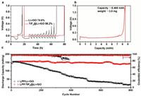 | Fig. 5. Electrochemical performance of TiF4@Li-rGO electrodes. (a) Aurbach measurement of the coulombic efficiency for the TiF4@Li-rGO and Li-rGO electrodes (b) Full Li stripping curve of the TiF4@Li-rGO electrode to 1.5 V versus Li+/Li, which shows a specific capacity of ~2823.0 mAh/g. (c) Performance of full cell comparison between LFP/Li-rGO and LFP/TiF4@Li-rGO cells. | |