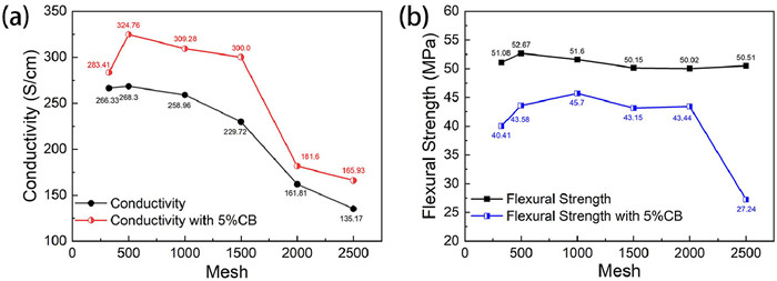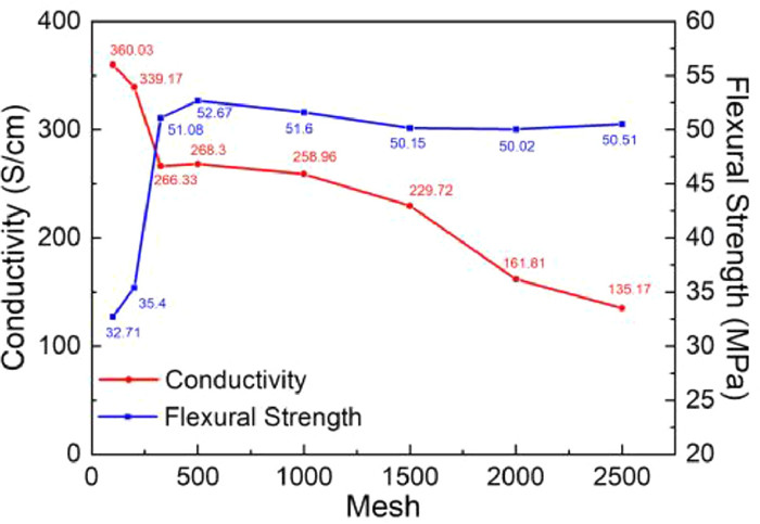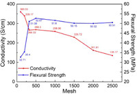 Graphite composite plates were prepared from flake graphite with different particle sizes, and the relationship between the internal structure of plate and its electrical conductivity and flexural strength was discussed. The selected scale graphite mesh numbers include 100 mesh, 200 mesh, 325 mesh, 500 mesh, 1000 mesh, 1500 mesh, 2000 mesh and 2500 mesh. The particle sizes of graphite with different mesh numbers are shown in Table 1. As shown in Fig. 1, as the graphite particle size becomes smaller and smaller, the conductivity declines rapidly at first, then appears a relatively stable platform, and finally slowly declines. When the particle size of graphite decreases from 100 mesh to 325 mesh, the conductivity decreases rapidly from 360.03 S/cm to 266.33 S/cm. The decrease of graphite particle size leads to an increase in the number of graphite particles per unit volume and the number of graphite particles along any conductive path. The graphite is bonded together by non-conductive resin at the contact node to form a transition phase with poor electrical conductivity. Macroscopically, the increase of contact nodes shows that the in-plane conductivity of graphite composite plate decreases rapidly.