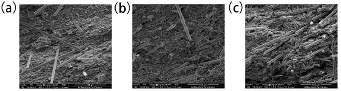 | Fig. 6. SEM images of section of composite plates with different carbon fiber concentrations. (a) 3%, (b) 5%, (c) 7%. | |