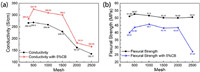 | Fig. 3. Variation of properties of composite plate with 5% concentration of conductive carbon black additive with different graphite particle size. (a) conductivity, (b) flexural strength. | |