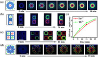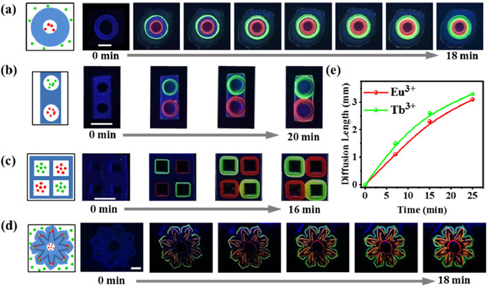 | Fig. 2. Spatial fluorescence color control within the Agar/P6A hydrogel matrix through local Eu3+/Tb3+ diffusion. (a-d) Photos showing the time-dependent fluorescent color change within the hydrogel matrix. (e) The diffusion kinetics of Eu3+ and Tb3+ in the hydrogel at room temperature. All pictures were taken under a 254 nm UV lamp. Scale bars: 10 mm. | |