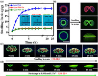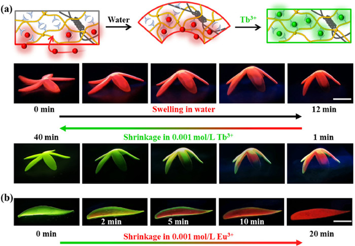 | Fig. 4. Bio-inspired synergistic shape/color switchable actuation. (a) Illustration and photos showing 2D-to-3D swelling deformation in water, and simultaneous color/shape changes of the artificial flower-shaped hydrogel actuator in aqueous Tb3+ solution. (b) Photos showing synergistic shape deformation and color change of the artificial leaf-shaped hydrogel actuator in aqueous Eu3+ solution. All pictures were taken under a 254 nm UV lamp. Scale bars: 10 mm. | |