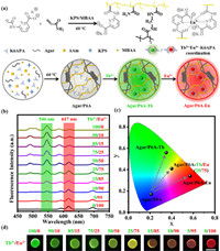 | Fig. 1. Preparation of the multicolor fluorescent polymeric hydrogels (Agar/P6A-Tb/Eu). (a) Illustration showing the synthetic procedure of Agar/P6A and Agar/P6A-Tb/Eu hydrogels. (b) Fluorescence spectra of the Agar/P6A-Tb/Eu hydrogels with varied Tb3+/Eu3+ molar ratio. Excitation at 254 nm for the fluorescence spectral measurements. (c) CIE (1931) coordinate diagrams of Agar/P6A and Agar/P6A-Tb/Eu hydrogels. (d) Photos of the Agar/P6A-Tb/Eu hydrogels with varied Tb3+/Eu3+ molar ratio, which were taken under a 254 nm UV lamp. Scale bars: 5 mm. | |