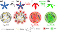 | Scheme 1. (a) The flower-shaped Agar/P6A hydrogel object and its chemical structure. (b) Local diffusion of Eu3+ into the hydrogel matrix from the hydrogel edge. (c) 2D-to-3D shape deformation of the flower-shaped hydrogel due to the differential swelling capacities between the outer and inner parts. (d) Synergistic shape and color changing actuation in aqueous Tb3+ solution. | |