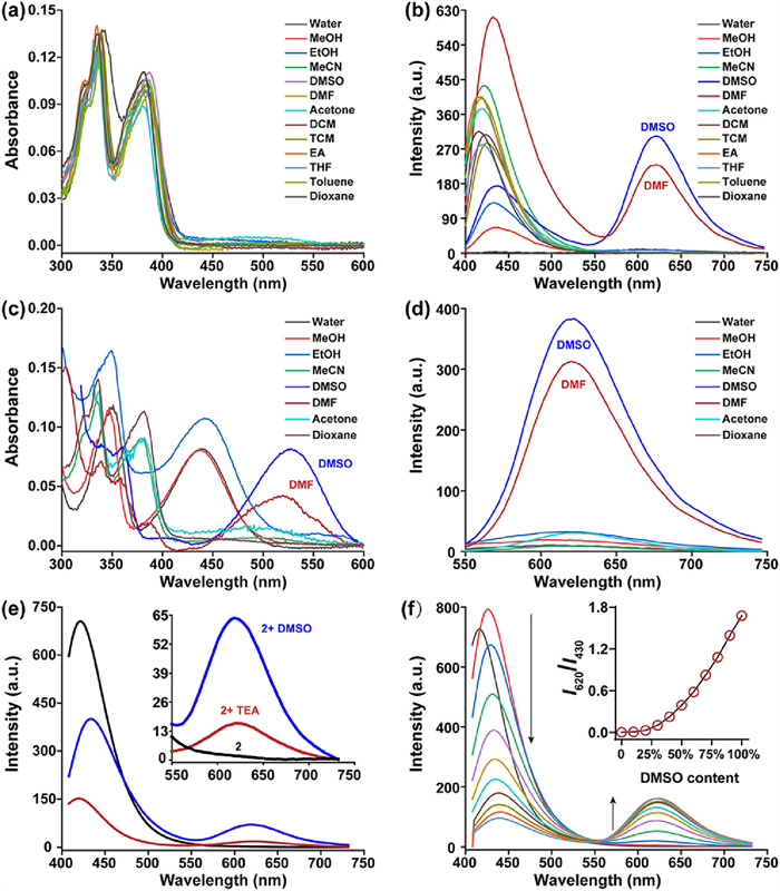 | Fig. 1. Absorption and fluorescence emission spectra of compound 2. (a) Absorption and (b) fluorescence emission spectra (λex = 380 nm) in various solvents. (c) Absorption and (d) fluorescence emission spectra (λex = 450 nm) after reaction with 0.1% aqueous sodium hydroxide solution (10 mmol/L). These solvents were chosen because they were soluble in water. (e) Fluorescence emission spectra before and after adding triethylamine (0.5%) and DMSO (30%) to the acetonitrile solution. (f) Fluorescence emission spectra of dioxane-DMSO system. Inset: the fluorescence intensity ratio (I620/I430) of the dioxane-DMSO system. | |