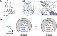 | Scheme 1. (a) Structures of naphthalimide-derived probe 1 and compound 2. (b) The reaction of probe 1 with SNAP-tag. After covalently binding to the SNAP-tag protein, probe 1 displayed the ESPT process due to the localization into the polar, hydrophobic, and proton acceptor environment of the SNAP-tag. (c) Structure–function analysis of SNAP-tag fluorophore–substrate interactions. The BG-bound variant of SNAPC145A (PDB entry 3KZZ) is selected as the crystal of SNAP protein for docking. SNAP protein is represented as a cartoon, and the ligands and residues are represented as sticks and lines, respectively. Putative hydrogen bonds and corresponding distances are indicated by dashed lines. | |