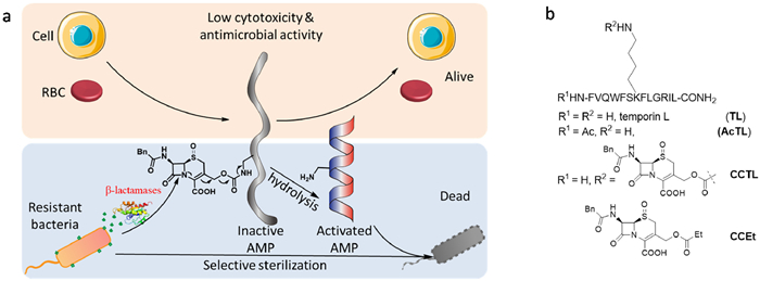 | Fig. 1. (a) Schematic diagram of β-lactamase-activatable antimicrobial peptide (AMP) for the selective sterilization of resistant bacteria. (b) Chemical structures of AMPs and related compounds in this study. | |