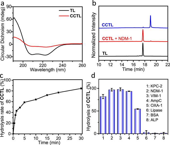 | Fig. 2. In vitro characterization of cephalosporin-caged AMP CCTL. (a) CD spectra of TL and CCTL in a DSPE solution at r.t. (b) HPLC traces of CCTL before and after incubation with NDM-1 (20 nmol/L) at 37 ℃ for 2 h. (c) Hydrolysis of CCTL incubated with NDM-1 (3 nmol/L) at 37 ℃ in a period of 0.5 h. (d) HPLC-analyzed hydrolysis of CCTL upon incubation with a variety of proteins for 2 h at 37 ℃. 1: KPC-2 (10 nmol/L); 2: NDM-1 (10 nmol/L); 3: VIM-1 (10 nmol/L); 4: AmpC (10 nmol/L); 5: OXA-1 (10 nmol/L); 6: lipase (1 U/mL); 7: BSA (100 nmol/L); 8: ALP (1 U/mL). DSPE: 1,2-distearoyl-sn–glycero-3-phosphoethanolamine. Data are the average of two experiments. Error bars are ± s.d. | |