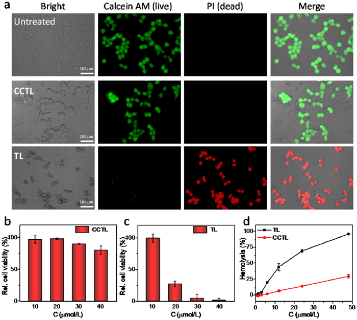 One of the major concerns for the application of AMPs in clinical practice is the toxicity to mammalian cells. To assess the biocompatibility of CCTL, we performed a live/dead staining assay using Calcein AM and propidium iodide (PI). As exhibited in Fig. 3a, upon incubation with 30 µmol/L of CCTL for 1 h, the Calcein AM-treated Human Embryonic Kidney 293 (HEK 293) cells emitted strong green fluorescence as the CCTL-free cells while the PI-treated cells were fluorescently silent, suggesting CCTL is compatible with HEK 293 cells. In sharp contrast, under identical circumstances, the TL-incubated HEK 293 cells generated strong red fluorescence but with basically no green fluorescence emission, indicating there were hardly any living cells left. Additionally, MTT assay was also performed to probe the cytotoxicity of CCTL, which gave comparable results as the live/dead staining assay: CCTL, showed significantly less impact on HEK293 cells compared to free TL (Figs. 3b and c). Additionally, the hemolysis test of TL and CCTL on human red blood cells (hRBCs) revealed the caging of TL with cephalosporin significantly reduced the hemolytic activity (Fig. 3d).