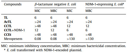 Encouraged by these results, we conducted further investigation to reveal the antibacterial activity of CCTL against β-lactamase-producing resistant microbes. We employed NDM-1-transformed E. coli [25] as a model resistant bacterium. Notably, the expression of NDM-1 in bacteria dramatically increases its resistance towards meropenem (MIC: 0.08 µmol/L vs. > 130 µmol/L). The measurement of MIC and MBC of CCTL revealed that this compound, despite low activity against susceptible E. coli, inactivates NDM-1-producing bacteria effectively with the MIC and MBC close to those of free TL. Given the fact that a large number of β-lactamases are plasmid-encoded enzymes, the selective inhibition of bla-expressing bacteria over β-lactam-susceptible bacteria might be of help to generate a selection pressure to reverse bacterial resistance to β-lactam antibiotics, and thus maintain the efficacy of the most widely used antibiotics.