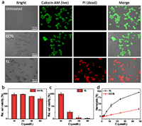 | Fig. 3. In vitro assessment of biocompatibility of CCTL and TL. (a) Microscopic fluorescence images of CCTL or TL (30 µmol/L)-treated HEK293 cells after staining with Calcein-AM (green: live) and PI (red: dead). Relative viability of HEK 293 cells after incubation with (b) CCTL and (c) TL for 24 h. (d) Hemolysis test of CCTL and TL on human red blood cells (hRBCs). Data are the average of three experiments. Error bars are ± s.d. | |
