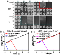 | Fig. 4. Time-kill kinetics of CCTL against NDM-1 expressing E. coli. (a) Colony images of NDM-1 expressing E. coli upon incubation with serial concentrations of CCTL or TL in Mueller–Hinton Broth (MHB) for indicated time points. (b) Time-kill curves of CCTL or TL and (c) time-kill curves for CCTL at indicated concentrations against NDM-1 expressing E. coli. Data are the average of three experiments. Error bars are ± s.d. | |