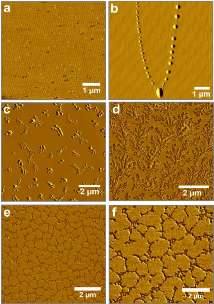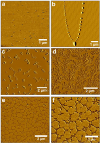 | Fig. 1. AFM images of (a, c, e) freshly prepared samples of peptides 1–3, and (b, d, f) the samples after incubating for one day. | |
