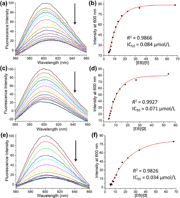 | Fig. 2. (a, c, e) Ethidium bromide (EB) displacement titration with 10 µmol/L stock solution of peptides 1, 2 and 3, and (b, d, f) the data is fitted with exponential decay first order function with the IC50 values of 0.084, 0.071 and 0.034 µmol/L, respectively. | |