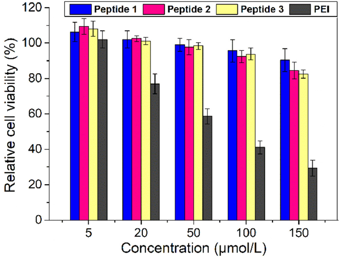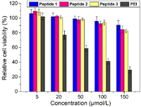 | Fig. 4. Concentration-dependent cytotoxicities of peptides 1, 2, 3, and PEI against HeLa cells after 48 h incubation. | |