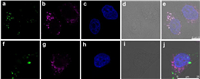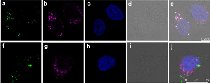 | Fig. 5. Confocal microscopy images of HeLa cells incubated with peptide 3 (100 µm) for 2 h (a–e) and 6 h (f–j), respectively. (a, f) Green fluorescence (GFP-labelled); (b, g) purple fluorescence (LAMP1-AF633 labelled); (c, h) blue fluorescence (Hoechst labelled); (d, i) bright field and (e, j) all merger together. | |