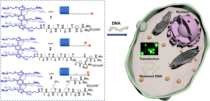 The concept of gene therapy by transferring exogenous DNA into cells was initially proposed by visionary scientists nearly half a century ago [1]. Efficient and controlled delivery of genetic information into living cells is crucial for both fundamental research and biomedical applications like genome analysis and gene therapy [2]. Due to the existence of barriers and poor stability in biological media, naked nucleic acids cannot directly penetrate lipid membranes and thus exhibit limited capacity to transfect cells [3]. Therefore, specially designed artificial gene delivery vectors are highly demanding and of great interest. Recombinant viruses such as replication-defective retro- and adeno-associated viruses have been proved to be efficient gene delivery vehicles. Nevertheless, their widespread applications and scale-up are limited by severe drawbacks such as toxicity, intrinsic immunogenicity, and high production costs [4]. Alternatively, the use of nonviral vectors can in principle circumvent these issues, and can compact and transport more genetic information [5]. Two main traditional classes of nonviral vectors are designed based on cationic lipids or polymers [6], among which cationic amphiphilic lipids have become the most promising vectors for gene transfection [7]. Supramolecular macrocyclic amphiphiles, featuring persistent shapes and highly ordered assembly, have developed several strategies for this application [8-11]. In particular, pillararenes, among countless supramolecular hosts [12-18], are a family of well-studied macrocycles with symmetric and rigid cavities that can bind with a variety of guests [19-23]. The ability of cationic pillararenes acting as gene carrier to bind, condense, and deliver DNA across cell membranes has been previously investigated [24-29]. Nevertheless, their gene transfection ability is only sporadically reported. In addition, it is also well-known that weakly basic guanidinocarbonylpyrrole (GCP) can efficiently bind to cell membrane and penetrate cells, delivering a large variety of genetic cargos and exhibiting excellent transfection efficiency [30-34]. We have previously reported that pillar[5]arene-modified amphiphilic peptide 1 (Scheme 1) bearing one GCP moiety was able to condense plasmid DNA and enable cell transfection in a manner that was dependent on the self-assembled morphology and conformation [35].