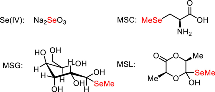 Four types of materials were employed as selenium fertilizers in this work (Fig. 1): Na2SeO3 [Se(IV)] was employed as the representative molecule of inorganic selenium salts. In natural products, selenium exists in the forms of selenoaminoacids, such as SeCys. Therefore, MSC, the methylated SeCys, was employed and this molecule was expected to be more stable than SeCys for the end-capping methyl restraining the oxidation of the free reductive –SeH moiety. MSG, the upgraded version of SG [38], was designed and developed for its good stability in aqueous solution, and testing its activities was our major objective in this work. MSL was prepared via the reaction of MeSeMg with L-lactide, similar to the method synthesizing MSG [38]. It was chosen as the candidate because L-lactide being prepared from L-lactic acid was also a bio-compatible molecule [39].