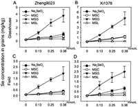 All the selenium fertilizers shown in Fig. 1 could enhance the selenium content in wheat grains (Grain-Se) in a way of gradually going up along with the increasing selenium fertilizer dosages (Fig. 2). The absorption of Na2SeO3 by wheat was higher than that of MSC (P < 0.01). The effects of the newly designed organoselenium fertilizers such as MSG and MSL varied greatly. The former was found to be the best fertilizer among the four candidates, while the later showed the poorest effect on selenium enrichment in wheat. Under the glasshouse conditions and using 0.38 mmol/L of MSG as fertilizer, the selenium content in wheat grain could reach 6 mg/kg, i.e., almost 4-5 times (or more) versus the same types of wheat grain being planted with Na2SeO3, MSC or MSL fertilizer (Fig. 2, images A and B)! Obviously, the priority order of Se-enrichment effects for the four selenium fertilizer candidates was: MSG >> Na2SeO4 > MSC > MSL.