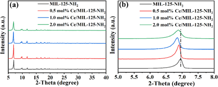 The structures of as-synthesized Ce/MIL-125-NH2 composites were revealed by XRD analysis. As presented in Fig. 1, the main diffraction peaks of MIL-125-NH2 with good crystallinity are consistent with the XRD pattern of our previous report [30], which proves the successful configuration. Meanwhile, the XRD patterns of Ce-doped MIL-125-NH2 samples are basically similar to that of MIL-125-NH2. But the diffraction peak at 6.9 ° shifts to a lower angle due to the larger radius of Ce3+ (1.034 Å) than Ti4+ (0.68 Å) (Fig. 1b). The shift offset is greater with the increased Ce doping content, indicating that the Ce species are successfully doped into the MIL-125-NH2 lattice without significantly affecting the crystal structure and crystallinity.