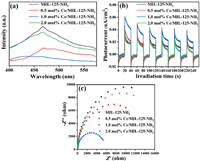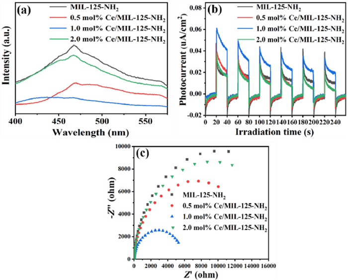 | Fig. 2. (a) PL spectra, (b) transient photocurrent response and (c) EIS Nyquist plots of MIL-125-NH2 and Ce/MIL-125-NH2. | |